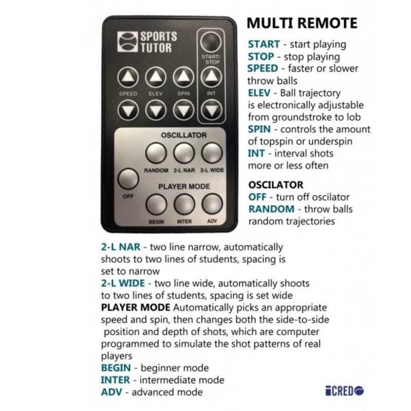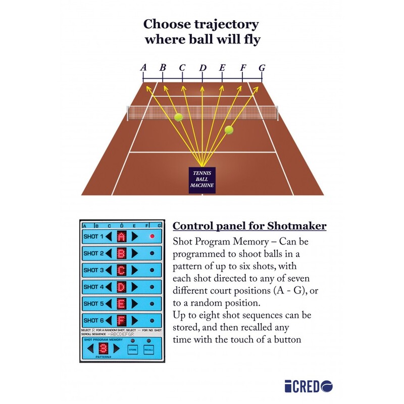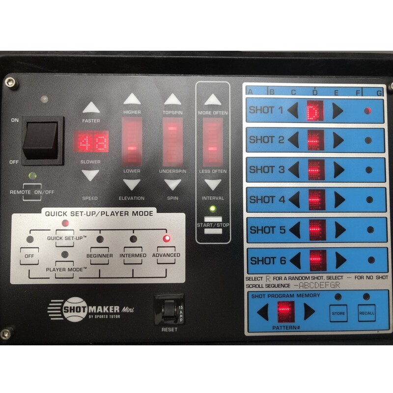 SHOTMAKER MINI Deluxe Quick Set-up – Just push the ‘Quick Set-up’ button, and then either the Beginner, Intermediate or Advanced button, to throw a repeating shot for the chosen skill level. Shot Program Memory – Can be programmed to shoot balls in a pattern of up to six shots, with each shot directed to any of seven different court positions, or to a random position. Up to eight shot sequences can be stored, and then recalled any time with the touch of a button. Includes Tennis Tutor patented Player Mode™.
